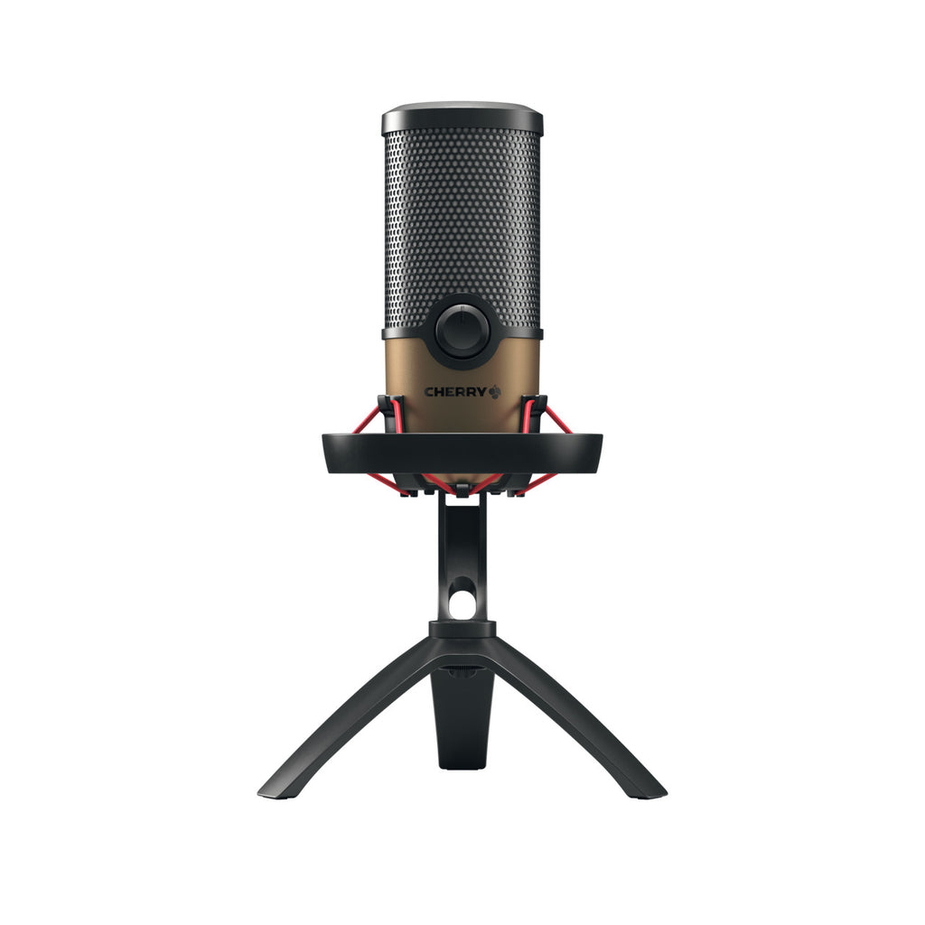 Le CHERRY UM 9.0 PRO RGB séduit par sa conception. Avec son trépied entièrement métallique qui lui assure une bonne stabilité et ses couleurs noir mat et cuivre, ce microphone USB profession-nel attire tous les regards.