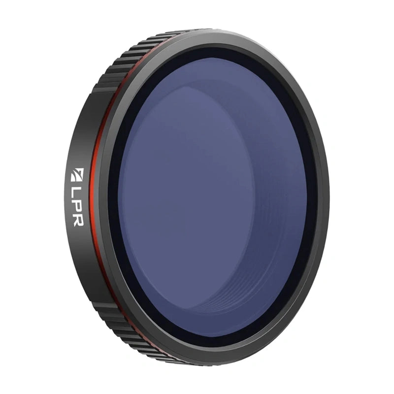 Black photographic filter with bluish glass and "LPR" inscription on the housing, shown on a gray background.