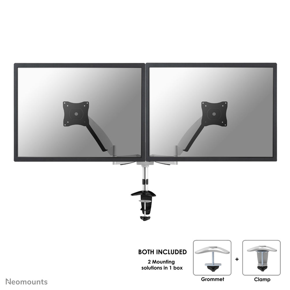 Le support de bureau Neomounts, modèle FPMA-D950D, s'incline, se tourne et pivote, il est adapté pour deux écrans plats jusqu'à 27" (69 cm). Ce support est un excellent choix pour économiser de l'espace sur les bureaux en l'installant à l'aide d'une pince de bureau ou œillet à monter.