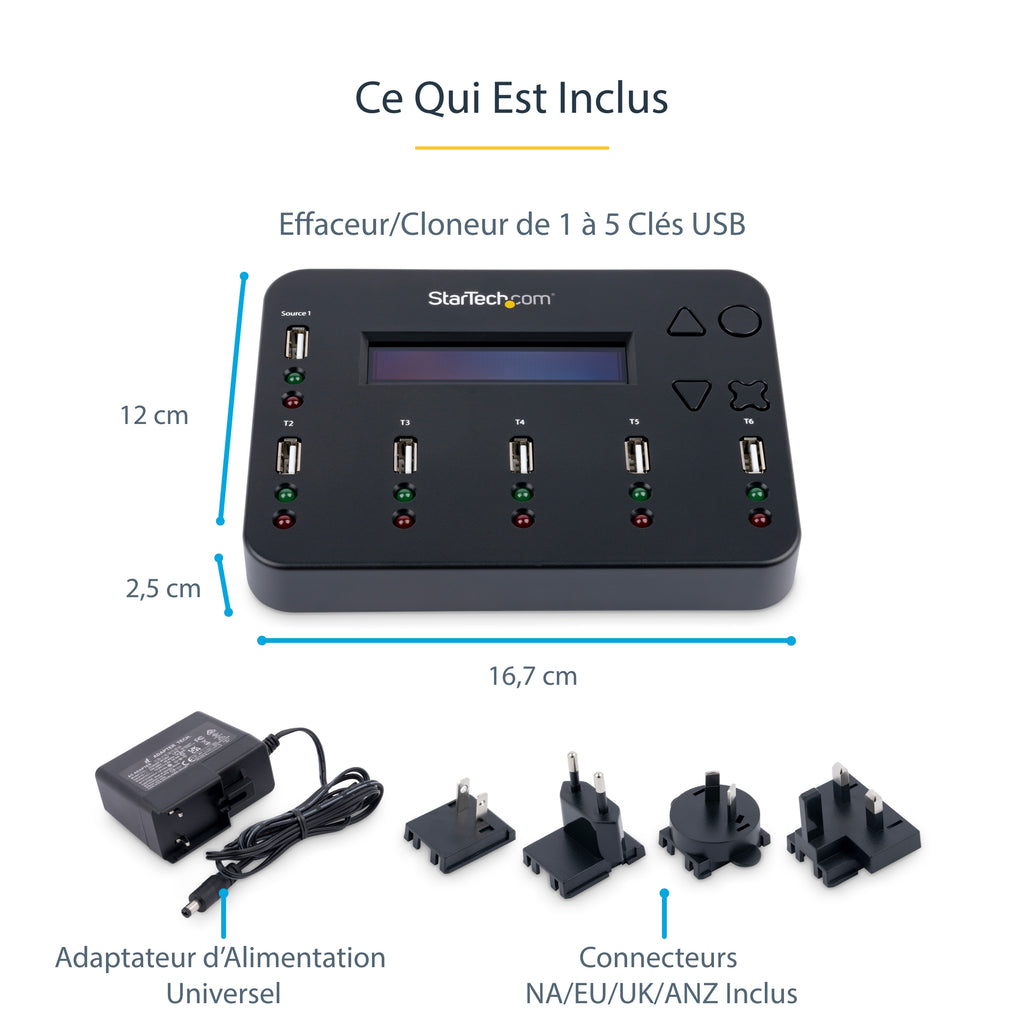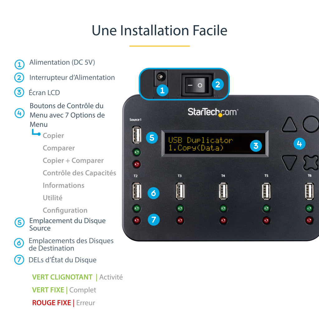 Le duplicateur et effaceur de clés USB USBDUP15 One-to-Five vous permet de cloner rapidement jusqu'à cinq copies d'une seule clé USB, ou d'effacer en toute sécurité jusqu'à cinq clés USB, sans avoir besoin de les connecter à un ordinateur hôte.