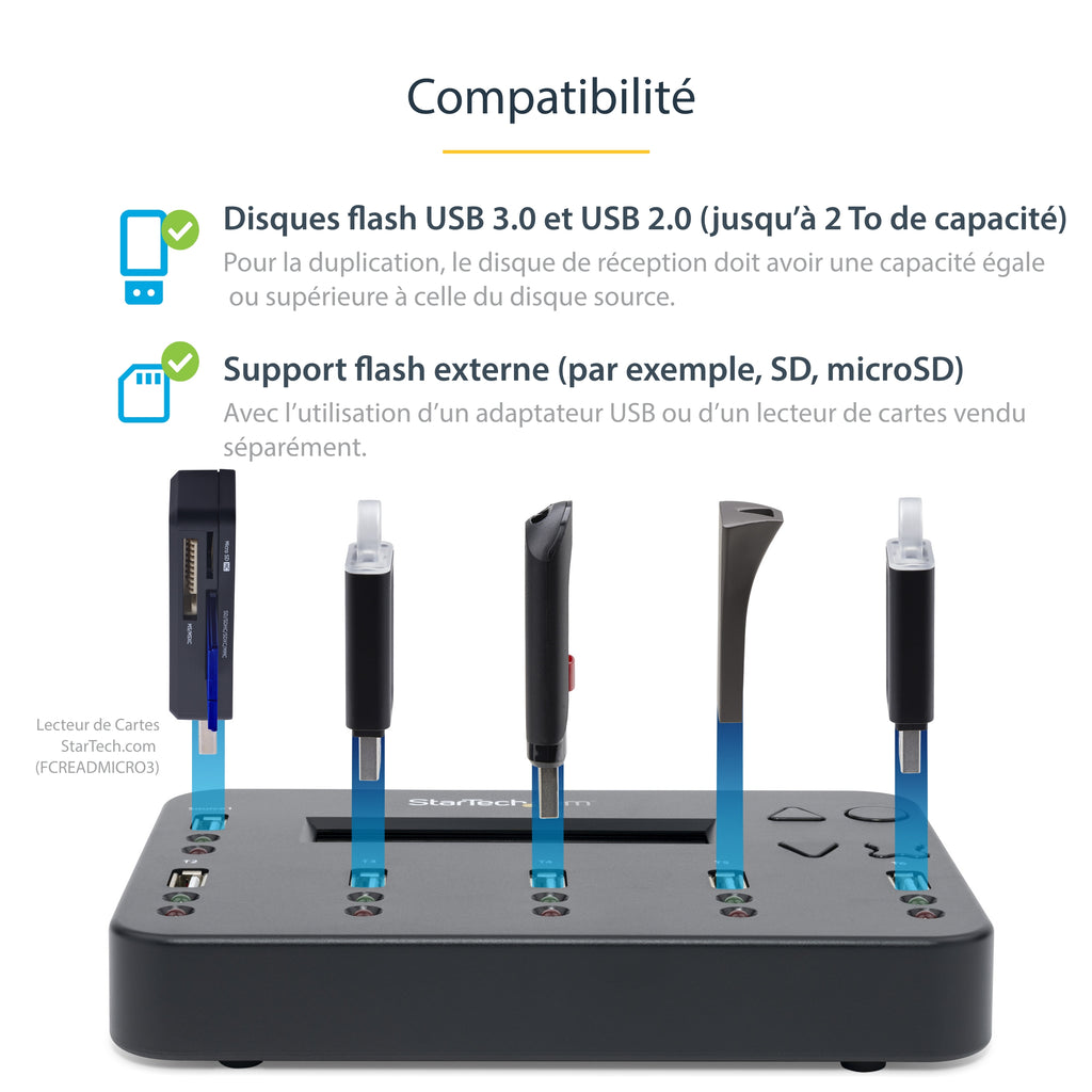Remarque : Le duplicateur de clés USB USBDUP15 prend en charge la copie/clonage vers des disques durs ou SSD via une station d'accueil pour disque dur ou un boîtier USB (vendus séparément).
