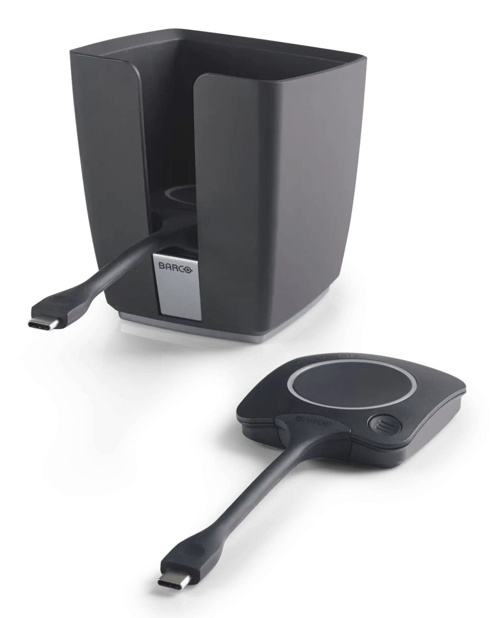 Placez dans vos salles de réunion une station de rangement de boutons ClickShare pratique et élégante, ainsi que des boutons supplémentaires pour permettre à plusieurs participants de partager du contenu sans avoir à se passer continuellement des boutons ClickShare.