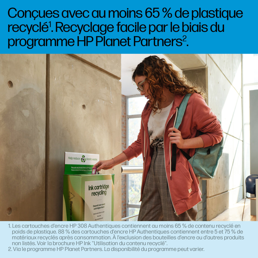 Une technologie de pointe[1] fait de la qualité et de la fiabilité au centre des préoccupations de ces cartouches d'encre HP authentiques. [2] Conçue avec au moins 65 % de plastique recyclé[3], vos cartouches usagées se recyclent facilement et gratuitement grâce au programme HP Planet Partners. [4]