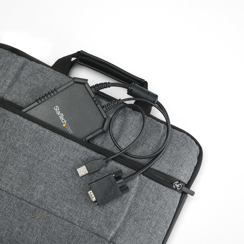Utilisez cet adaptateur USB crash cart pour transformer votre ordinateur portable en une console KVM portable permettant d'accéder à des serveurs, des GAB et des bornes interactives avec transfert de fichiers et acquisition vidéo