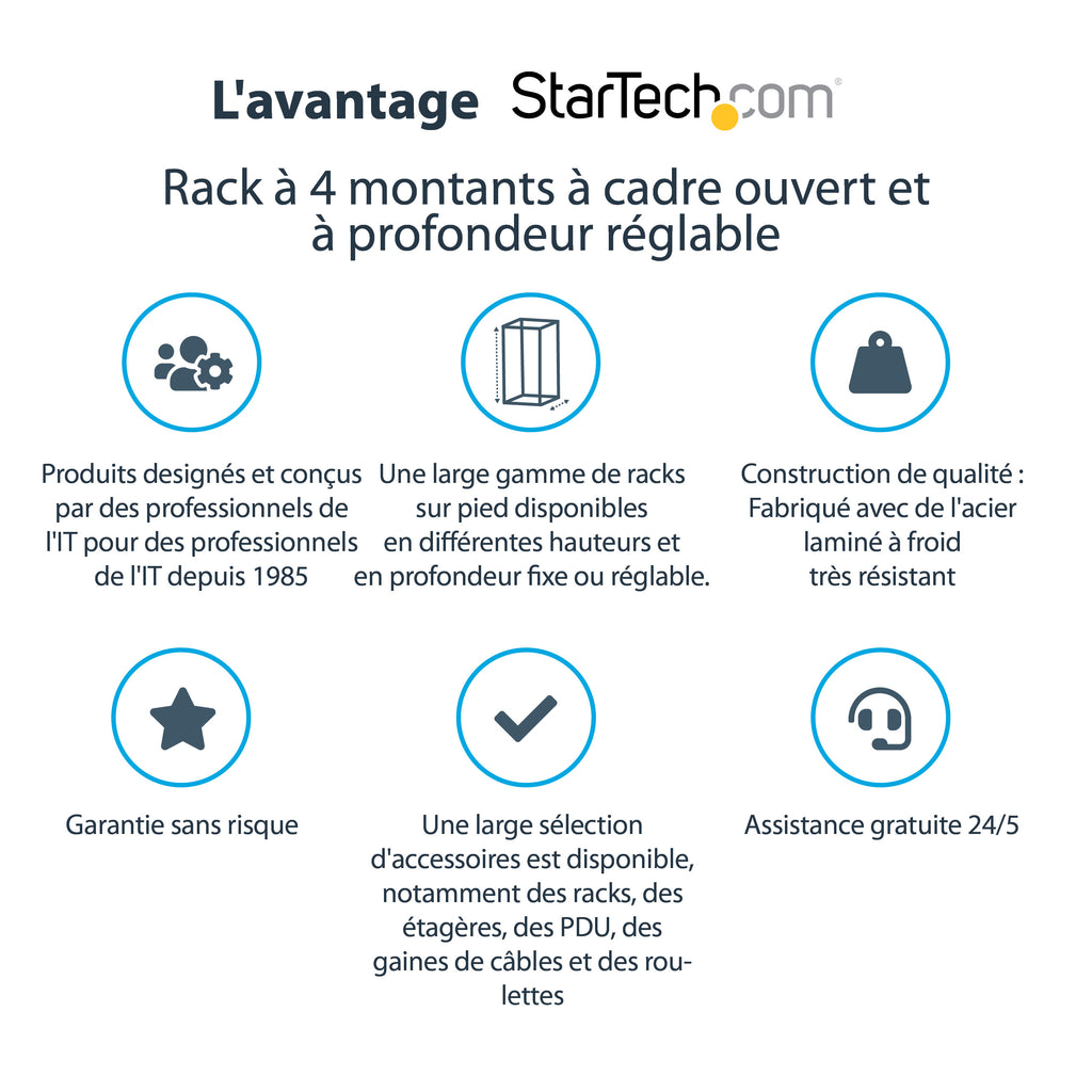 Dit duurzame rek met 4 palen kan een statische belasting tot 544 kg dragen. Bovendien voldoet het aan diverse industriële reknormen (EIA/ECA-310, IEC 60297, DIN 40494) voor een universeel ontwerp dat compatibel is met de meeste reksystemen.
