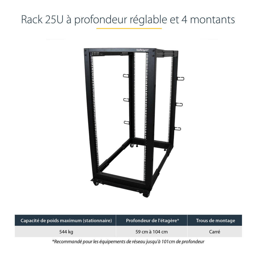 Met het 25U 4POSTRACK25U serverrack kunt u uw servers, maar ook uw netwerk- en telecommunicatieapparatuur in een robuust open framerack met verstelbare diepte opbergen.
