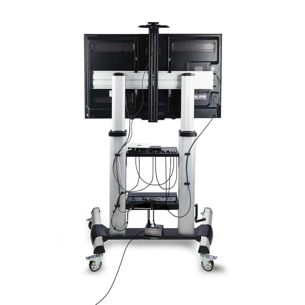 De robuuste aluminium en stalen constructie van de tv-standaard maakt hem ideaal voor commercieel gebruik in omgevingen met meerdere gebruikers en frequente verplaatsing tussen verschillende ruimtes. Handgrepen aan de achterkant van de kolommen, gecombineerd met 10 cm wielen, zorgen voor soepel transport tussen locaties. Eenmaal op hun plaats, kunnen alle wielen worden vergrendeld. Afmetingen voet: 1138 x 700 mm (44,8 x 27,5 inch).