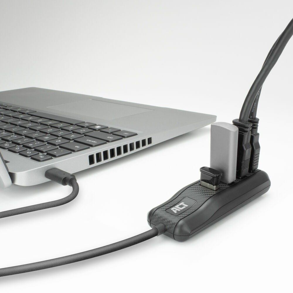 Le hub USB-C ACT AC6420 ajoute 4 ports USB-A à votre ordinateur portable ou à votre ordinateur avec USB-C. Le hub est compatible avec la norme USB 3.2 Gen1, également connue sous le nom d'USB 3.0, qui offre un SuperSpeed USB 5Gbps. Grâce à son câble pratique de 50 cm, le hub ACT AC6420 USB-C garantit une connectivité stable et sans encombrement pour vos appareils, que votre ordinateur portable soit sur un support ou posé sur un bureau, en évitant que le hub ne pende.