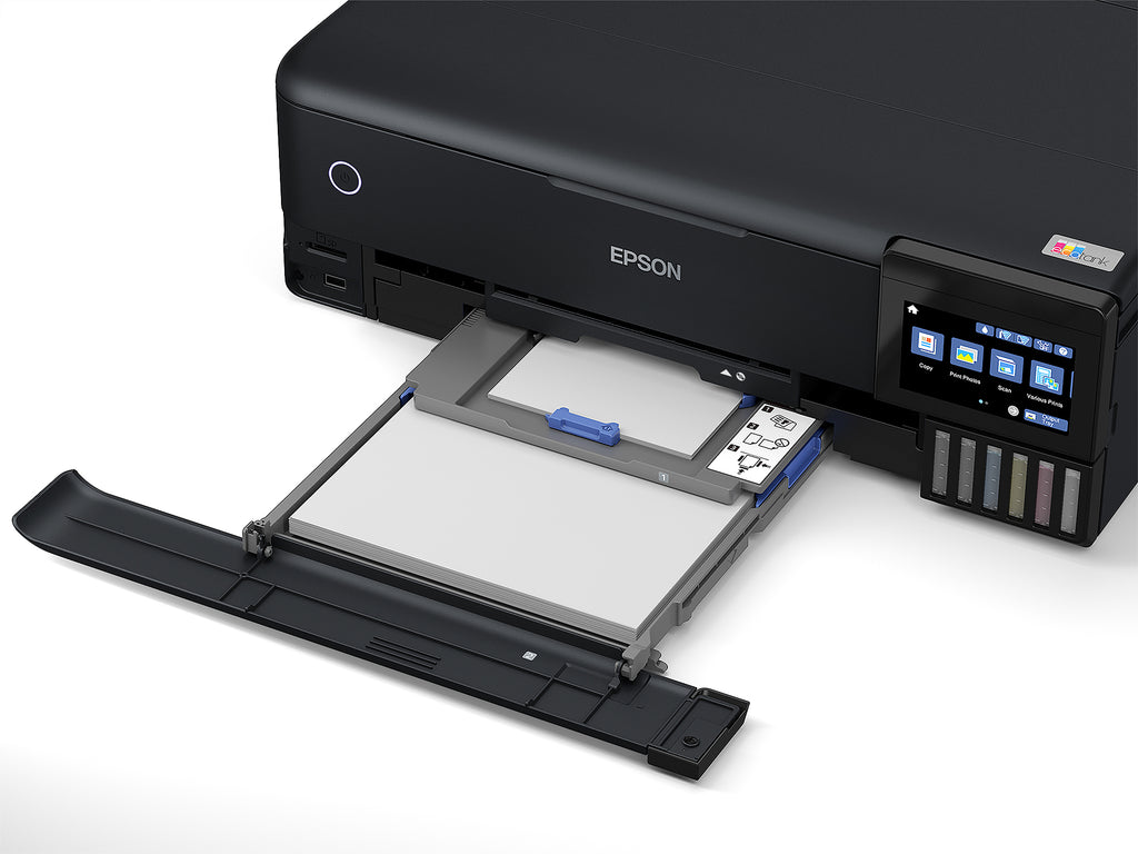 L'ET-8550 dispose de bacs papier photo et A4 avant et permet d'imprimer directement sur les CD/DVD adaptés. Le bac arrière A3+ accepte les supports spéciaux tels que les papiers et les cartes de dessin, tandis que l'alimentation papier directe A3+ vous permet d'imprimer sur des supports d'une épaisseur allant jusqu'à 1,3 mm et d'une longueur jusqu'à 2 m !