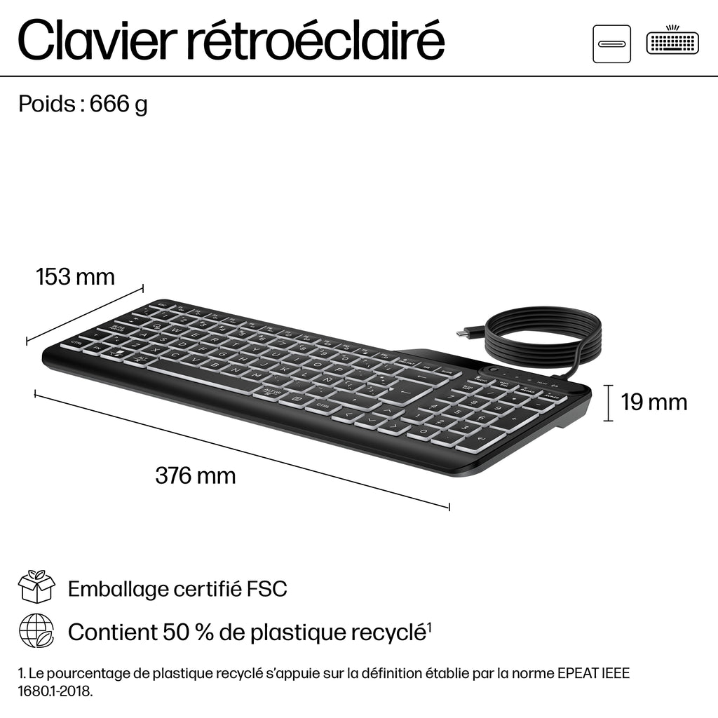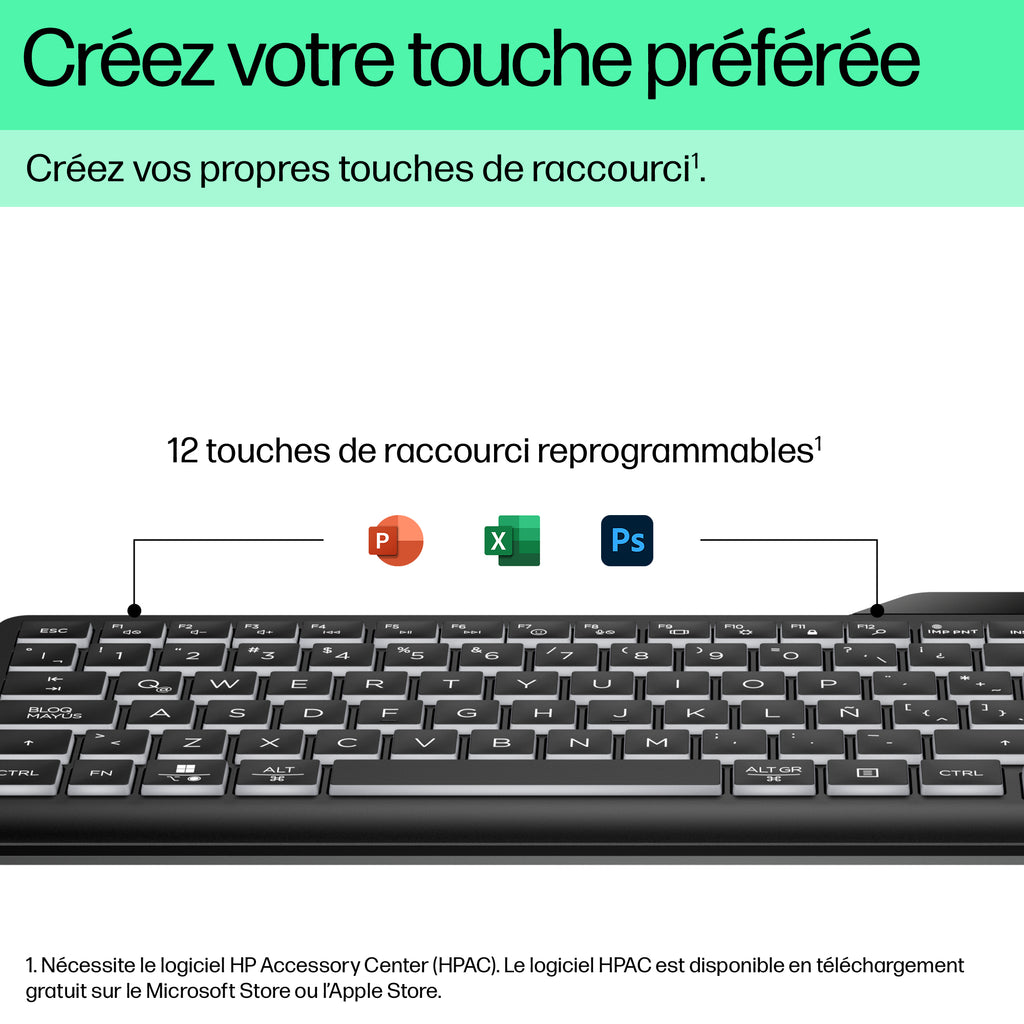 Avec ses touches blanches bien éclairées, ce clavier prêt à l'emploi ne manque jamais une miette. Branchez votre appareil et déplacez-vous avec des clés silencieuses et trois niveaux de LED à rétroéclairage lumineux. En outre, faites exploser votre productivité avec 12 touches programmables. Travaillez et jouez toute la journée sur le clavier filaire rétroéclairé fin et désinfectable[1] HP 400.