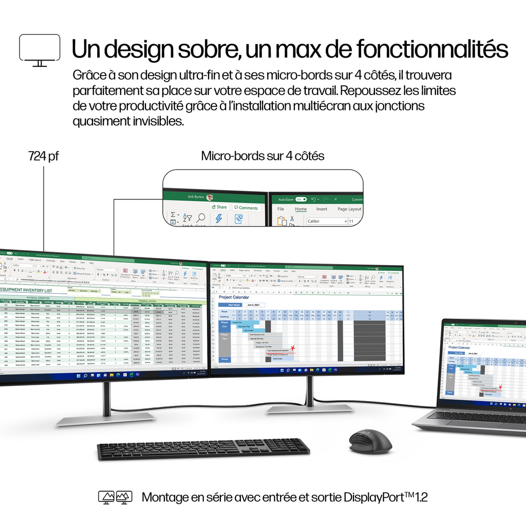 Capturez tous les détails avec l'écran Full HD 23,8 pouces HP Série 7 Pro. Profitez d'une image au réalisme saisissant et de couleurs précises sans réglage spécifique, d'un taux de rafraîchissement 100 Hz et d'un taux de contraste des couleurs de 1500:1[1]. Augmentez votre productivité avec un écran aux micro-bords sur 4 côtés et à l'ergonomie intégrée.