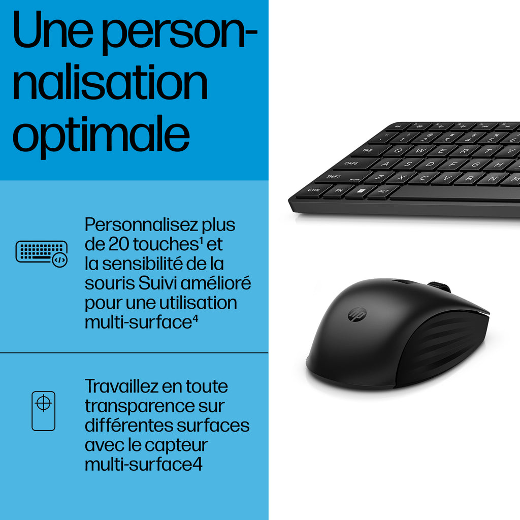 Tout est désormais accessible du bout de vos doigts avec un clavier et une souris sans fil, pour plus de confort, de productivité, de fiabilité et d'élégance. Profitez de la précision des mouvements de la souris et personnalisez jusqu'à une vingtaine de touches[1] pour aller toujours plus vite. L'ensemble clavier et souris est durable avec des plastiques recyclés[2] et facile à nettoyer et désinfecter[3].