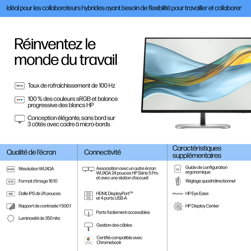 Conjuguez confort et efficacité avec un écran WUXGA 24 pouces HP Series 5 Pro. Configurez votre bureau selon vos besoins et où que vous soyez, grâce à un écran au design épuré, au confort ajustable et à la clarté d'image optimale.