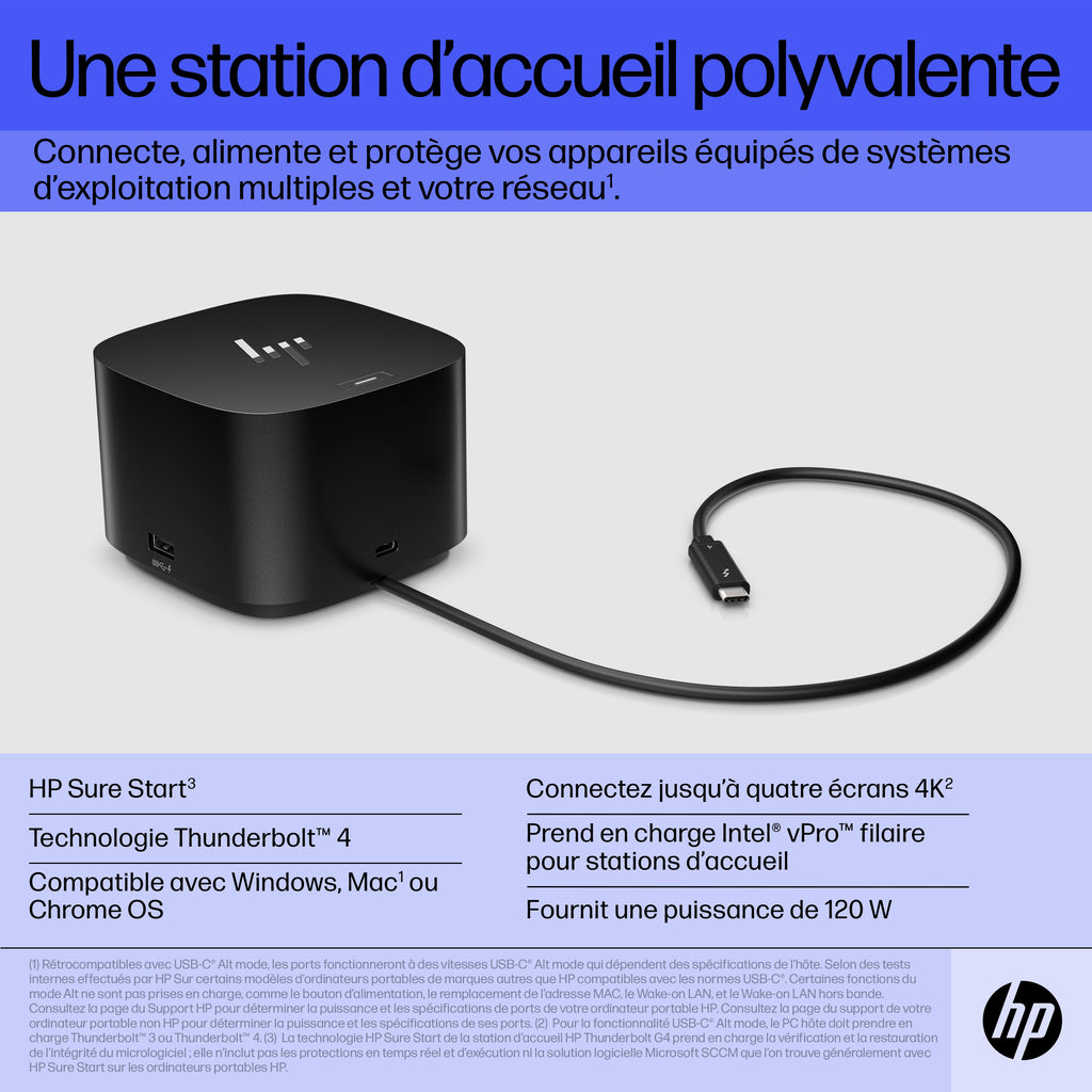 Boostez votre sécurité, votre productivité et votre connexion avec cette station d'accueil Thunderbolt™ 4. Elle protège votre réseau et vos appareils dès l'identification, prend en charge la compatibilité avec plusieurs systèmes d'exploitation[1] et peut accueillir jusqu'à quatre écrans 4K[2]. Idéale pour les équipes informatiques et les travailleurs hybrides, cette station d'accueil simplifie la gestion d'appareils, au domicile comme au bureau.