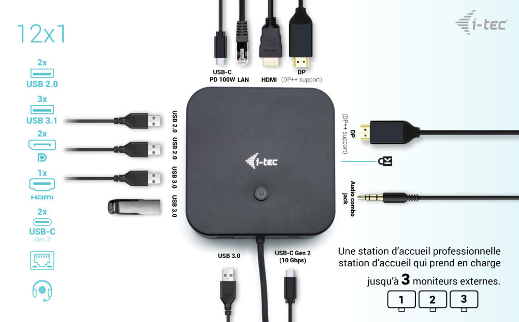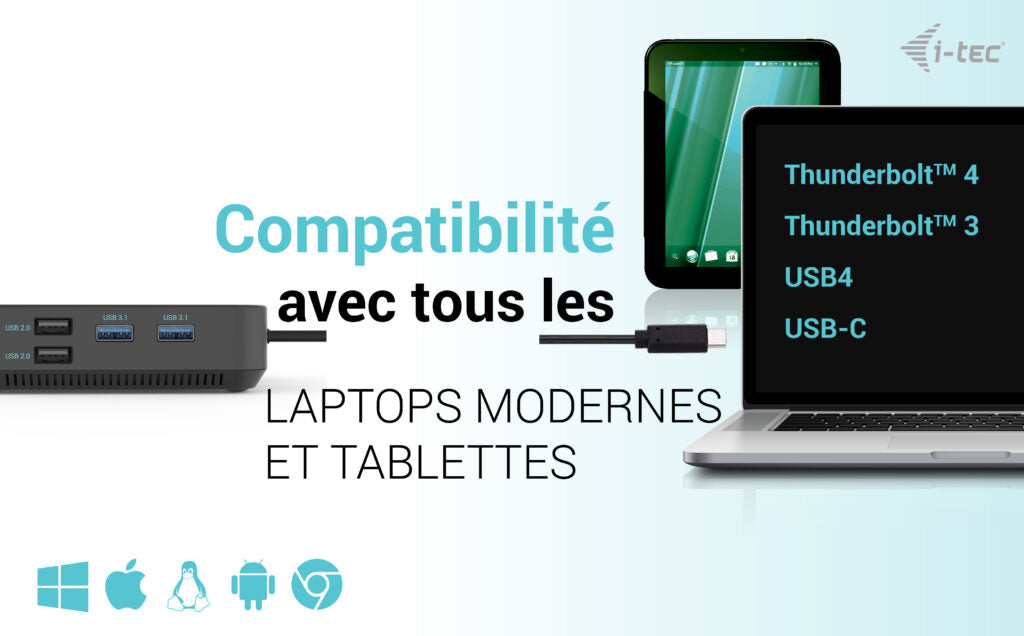 Un dock de bureau USB-C haute performance qui prend en charge jusqu'à 3x moniteurs externes 4K. Le dock est compatible avec tout ordinateur portable équipé d'un port USB-C, USB4 ou Thunderbolt 3/4. Bien entendu, il prend en charge la charge de votre ordinateur portable ou de votre tablette jusqu'à 100 W.
