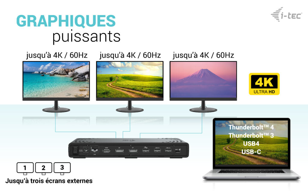 Une station d'accueil USB-C haute performance de nouvelle génération qui prend en charge la sortie vers jusqu'à trois moniteurs externes en haute résolution 4K. La station d'accueil peut être utilisée avec pratiquement tous les ordinateurs portables équipés de ports USB-C, USB4 et Thunderbolt » 3/4, tout en prenant en charge tous les systèmes d'exploitation courants.