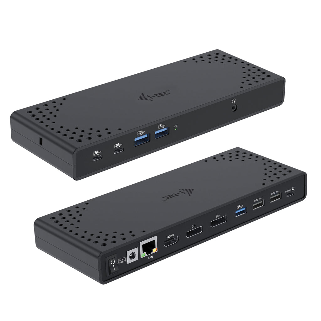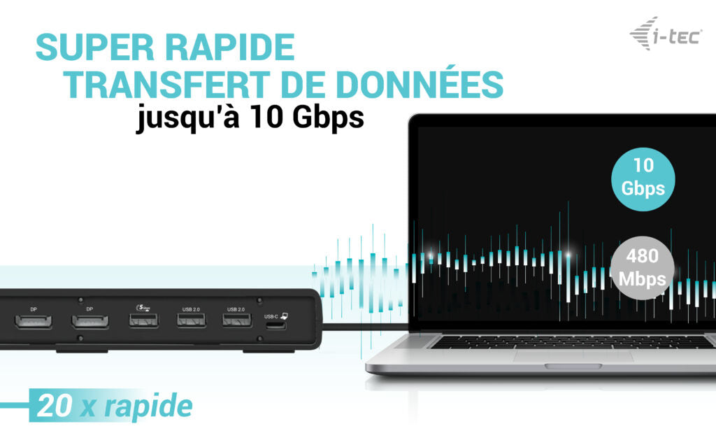 - 7 ports USB : 2x USB-C (10 Gbps) supportant la charge rapide BC 1.2 et 5x USB-A (1x Gen 2 (10 Gbps) supportant la charge rapide BC 1.2, 2x Gen 1 (5 Gbps) supportant la charge rapide BC 1.2 et 2x USB 2.0)