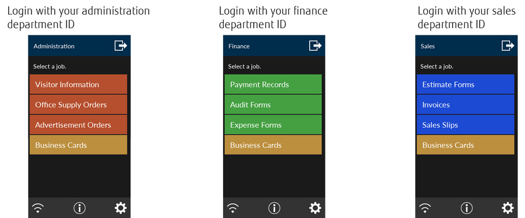 Les utilisateurs peuvent numériser et enregistrer des documents sans ordinateur local. Il leur suffit de se connecter au scanner à l'aide de l'authentification utilisateur et de sélectionner une tâche dans leurs menus personnalisés sur l'écran tactile du fi-7300NX. Les menus de tâches personnalisés garantissent la saisie de données décentralisée efficace et sécurisée pour chaque utilisateur. Le fi-7300NX prend en charge l'authentification NFC (type A et B), ainsi que l'authentification utilisateur via la saisie d'un nom d'utilisateur et d'un mot de passe sur l'écran tactile. Il est également possible d'affecter différents menus de tâches à chaque scanner et de contourner les éventuels processus d'authentification.