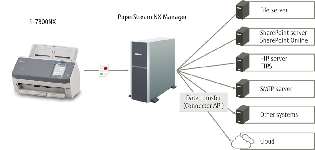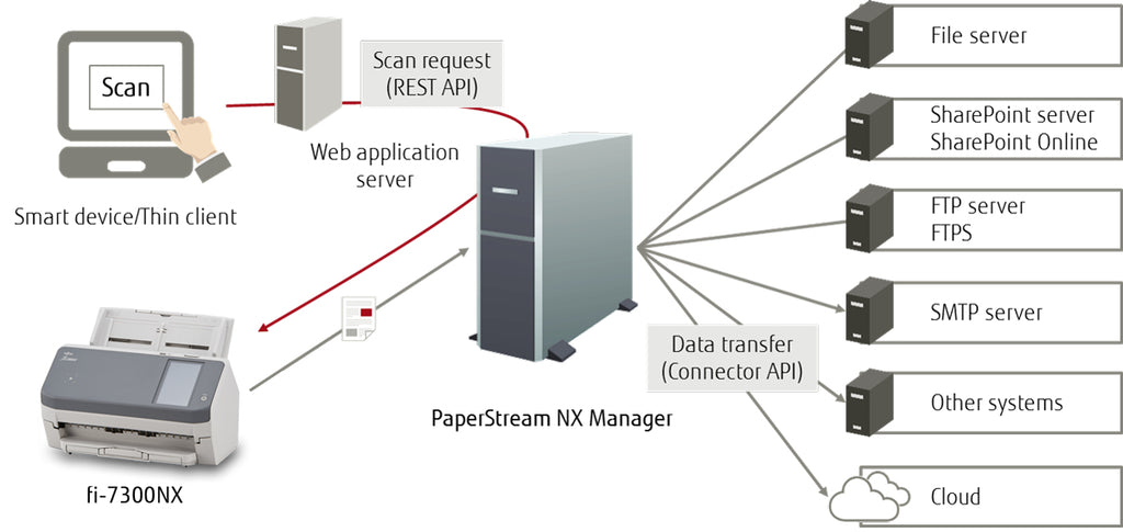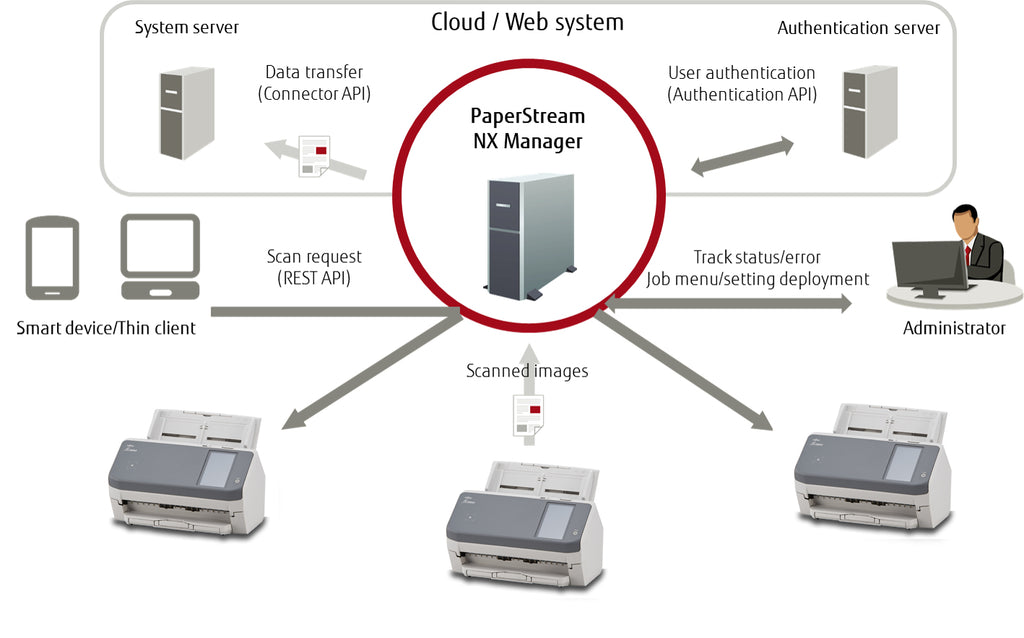 Grâce au logiciel PaperStream NX Manager, les utilisateurs peuvent lancer des numérisations depuis des applications mobiles ou Web ouvertes sur des appareils intelligents ou des terminaux client légers. L'intégration facile aux systèmes d'entreprise permet d'utiliser divers appareils pour les opérations de numérisation.