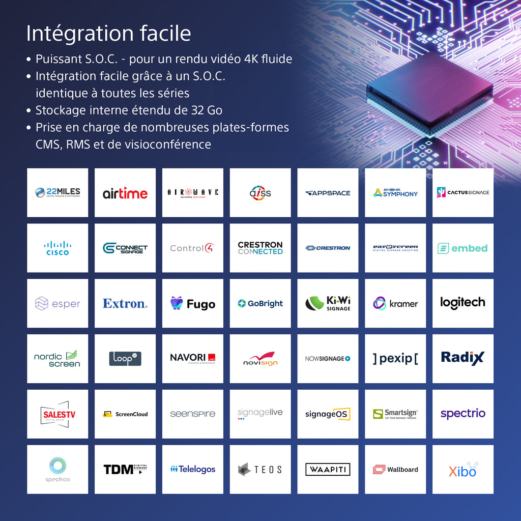La mémoire interne de certains autres écrans est monopolisée par le système d'exploitation, ce qui laisse peu d'espace pour vos propres applications et contenus. L'écran BRAVIA de 98" dispose d'une capacité de stockage interne doublée, 32 Go au lieu de 16 Go, ce qui laisse plus de mémoire pour les applications, les photos, les vidéos et l'affichage dynamique.