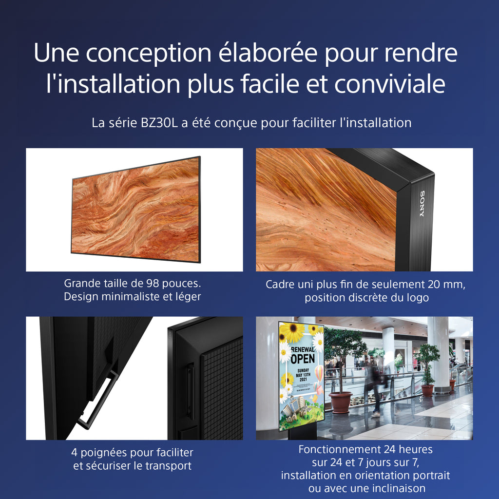 D'autres écrans dits professionnels ne sont guère plus que des téléviseurs avec quelques fonctionnalités supplémentaires ajoutées après la conception initiale. Ce BRAVIA de 98" est conçu spécifiquement pour faciliter une installation plus rapide, plus simple et plus flexible dans les environnements de commerce de détail et en entreprise. Les niveaux horizontaux inférieurs ergonomiques sont faciles à saisir, ce qui facilite sa manipulation et le confort de transport.