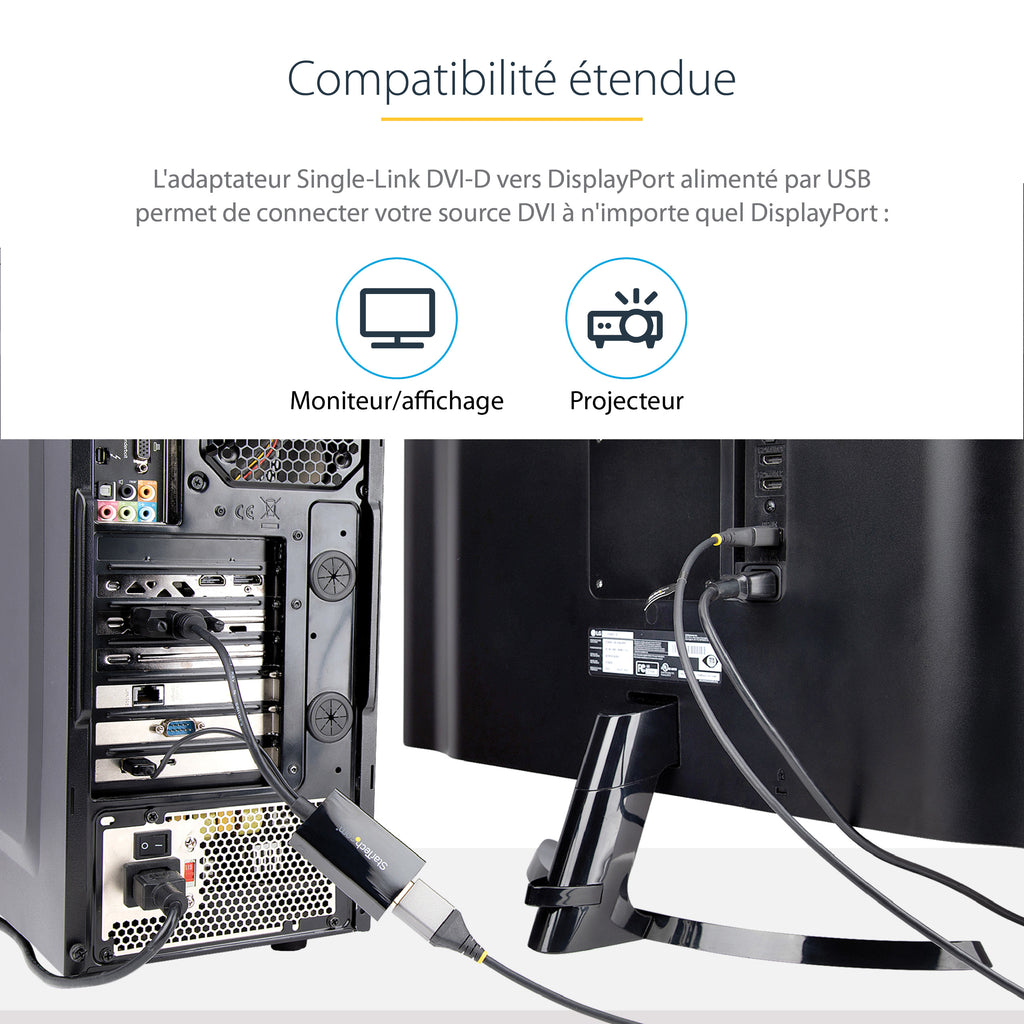 Le convertisseur DVI vers DisplayPort est alimenté par USB, ce qui vous permet de l'alimenter à l'aide d'un port USB de votre ordinateur, contrairement à certains convertisseurs qui requièrent des blocs d'alimentation externes encombrants. Les appareils alimentés par USB ne requièrent pas de prise secteur. Vous pouvez donc connecter un ordinateur DVI à un vidéoprojecteur ou écran DP lorsque l'accès aux prises de courant est limité ou impossible (par exemple, dans une salle de conseil ou poste de travail).
