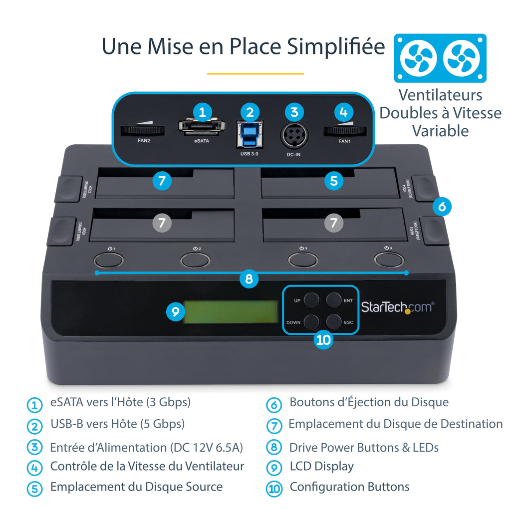 StarTech.com Duplicateur et Effaceur de Disques Durs à 4 baies, Cloneur/Copieur Autonome de HDD/SSD 1:3 SATA, Station d'Accueil USB 3.0 - eSATA vers SATA, Duplicateur de Disques Durs, Conception Sans Outillage