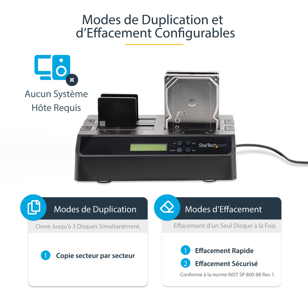 La station d'accueil/le duplicateur de disque dur 1 vers 3 USB 3.0 et eSATA SATDOCK4U3RE vous permet de copier/cloner un seul disque dur SATA sur trois autres disques SATA simultanément, en tant que périphérique autonome. Le duplicateur peut également servir de station d'accueil normale pour disque dur 4 baies lorsqu'il est connecté à un système informatique hôte. Les disques grande capacité (testés avec lecteurs 3,5 po jusqu'à 4 To et 2,5 po jusqu'à 1 To par baie) peuvent être utilisés pour nettement améliorer les capacités de stockage/sauvegarde de votre ordinateur.