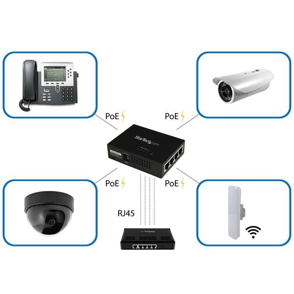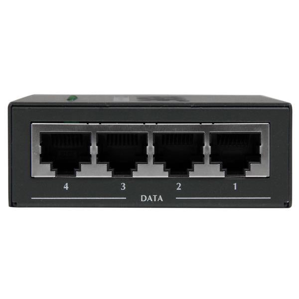 Assurez l'alimentation et transmettez des données à quatre appareils Power over Ethernet à l'aide de ce hub Midspan PoE+ à fixation murale