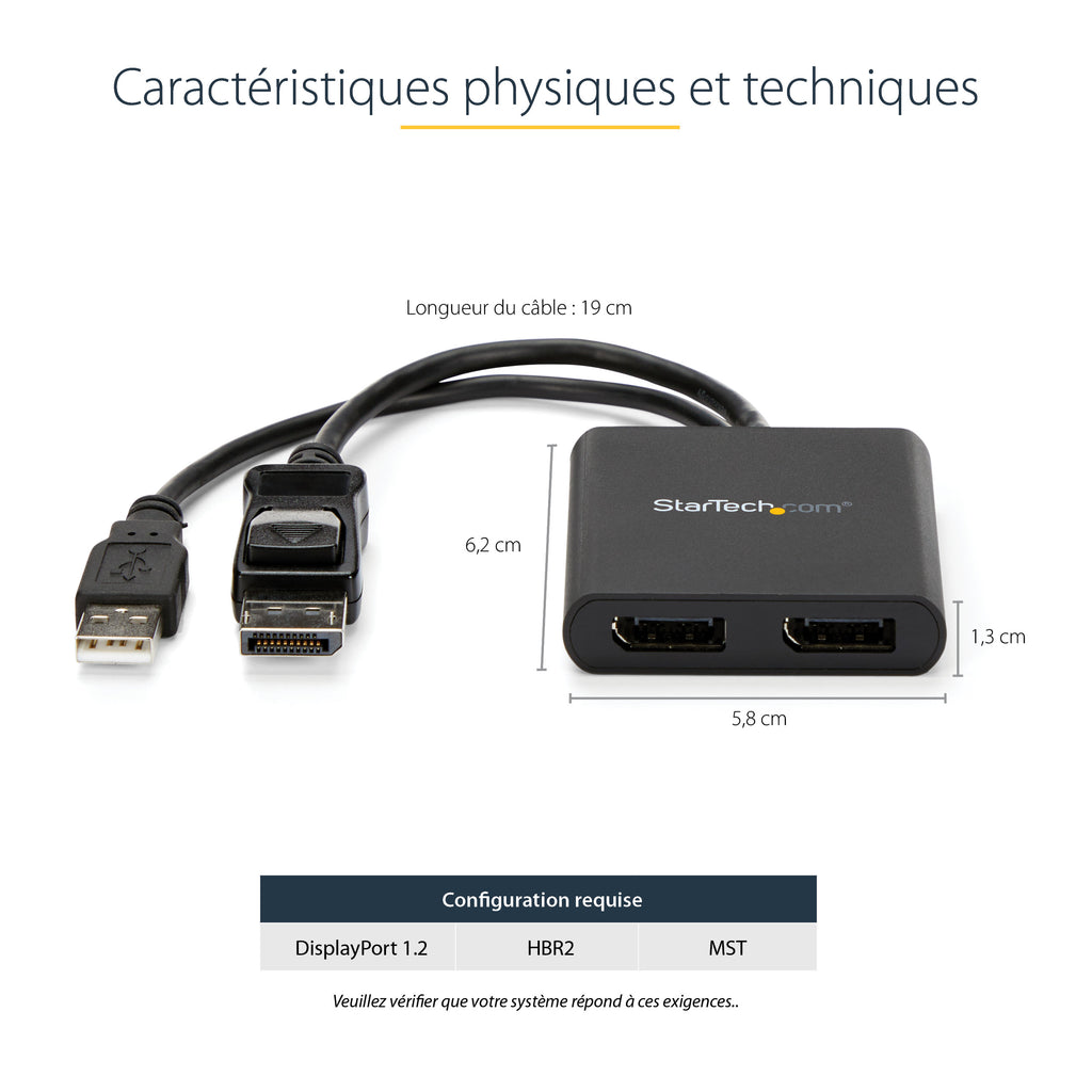StarTech.com Répartiteur DisplayPort 1.2 à Deux Moniteurs, Adaptateur Multi-Moniteur DisplayPort vers 2x DP, Hub MST Double pour Ordinateur 4K 30Hz ou 1080p 60Hz, Alimentation par Bus USB - Windows Uniquement
